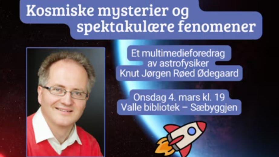 Om "Kosmiske mysterier og spektakulære fenomener" i Sæbyggjen i kveld! Det blir høgtsvevande i Sæbyggjen i Valle i kveld onsdag 4. mars klokka 19, når astrofysikar Knut Jørgen Røed Ødegaard kjem med multimedieføredrag om ...