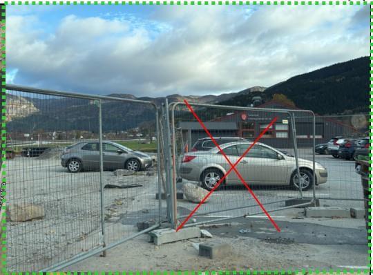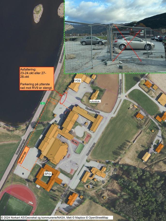 Parkeringsplassane (ei rekkje) lengst mot Rv9 i vest vert sperra dei to dagane som det skal asfalterast. Sjå på biletet i saka for illustrasjon. Ein må bruke parkeringsplassane sør mot hybelbygget og barnehagen, og dei som kan bør la bilen stå, og ta beina/syklen i bruk, eller samkøyre med andre.