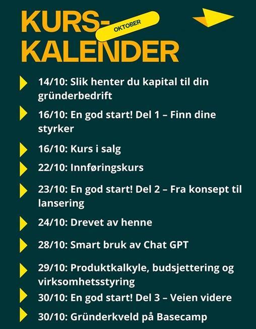 Driv Agder Etablerersenteret med mange kurs i haustDriv Agder Etablerersenter har eit rikhaldig tilbod for kursing for etablerarar i haust. Her kan ein lære alt frå sal til Chat GPT! Publisert av Ole Birger Lien Publisert 14.10.2025 10:36 Sist endra 14.10.2025 10:36 Frå 14. oktober og ut månaden er det eine kurset etter det andre som kan vere aktuelt for dei som skal etablere eller akkurat har etablert eiga verksemd.HER er lenke til Driv Agder sitt kurstilbod.