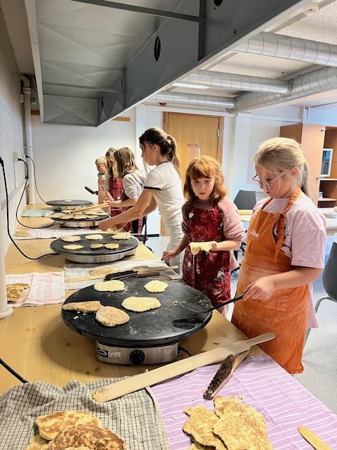 3.- og 4. klassingane på skulen har sjølv stått for steikinga, medan SFO altså får hjelp av dei noko eldre elevane. Det har handla om Hardangerkaker i bakekjellaren, og alle borna kjem med eigen kjevle, forkle og kjøkkenhandkle.