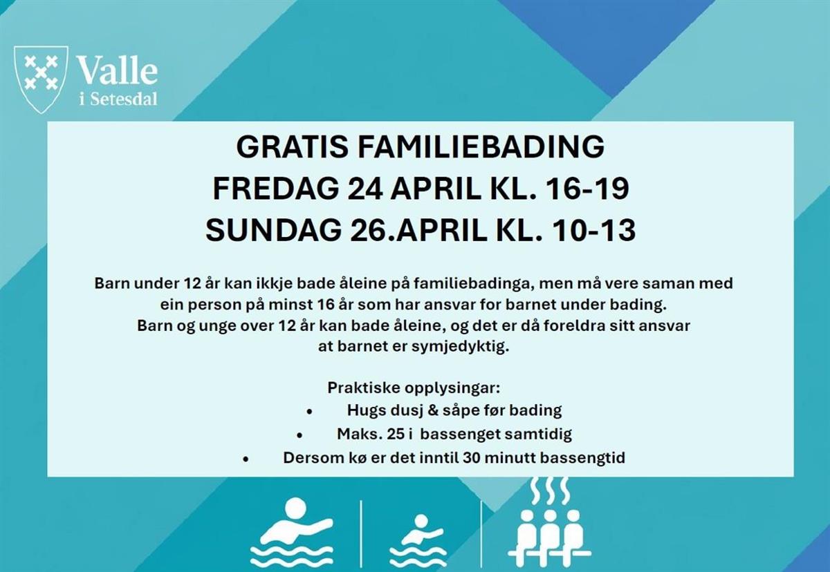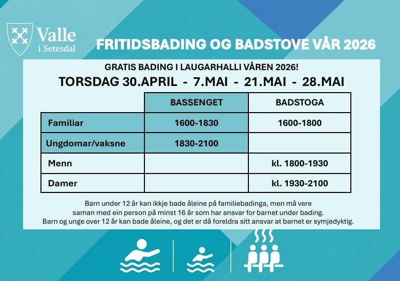 Også utetter våren er det gratis bading i Valle. Dette gjeld torsdagane 30. april, 7. mai, 21.- og 28. mai. Familiebadinga er 16.00-18.30, ungdom/vaksne 18.30-21.00. Same retningsliner for tryggleik og liknande gjeld som elles.
