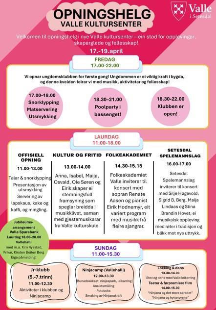 I morgon laurdag er det offisiell opning klokka 11-13. Ordførar Lars Tarald Myrum klypper snora, og det kjem helsingar frå andre aktørar. Utsmykninga skal presenterast, og frå klokka 13 går det slag i slag med konsertar i regi av aktørar som kulturskulen, Folkeakademiet Valle og Setesdal Spelemannslag. Så skal ein heller ikkje gløyme at det er laurdagskvelden frå klokka 18-20 at Valle sparebank byr inn til jubileumsfest i Vallehalli. Der er det eiga påmelding via banken - men om nokon skulle gløyme å melde seg på bør ein likevel prøve seg i døra og satse på at ein slepp inn.