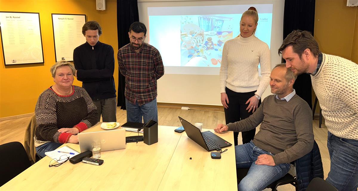 Frå arbeidsmøtet mellom studentar frå UIA og Valle kommune. Frå venstre: Åse Ingebjørg Flateland, rådgjevar næring og forvaltning i Valle kommune, Cristoffer Skjelstad, Yusef Said, Linn Bjørkegra, Vidar H. Homme, kommunedirektør i Valle kommune og lengst til høgre Anders Solheim Nesdal.
