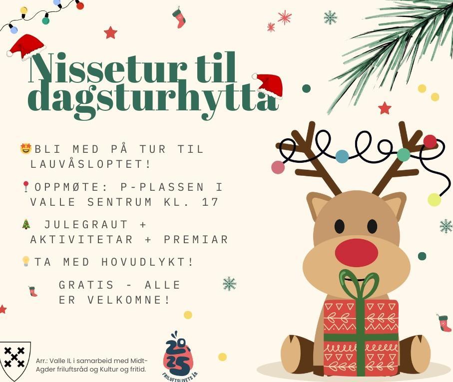 Valle kommune skipar onsdag i samarbeid med Midt-Agder friluftsråd til nissetur til dagsturhytta Lauvåsloptet i Valle. Det er avgang frå den store parkeringsplassen i Valle sentrum like før klokka 17.