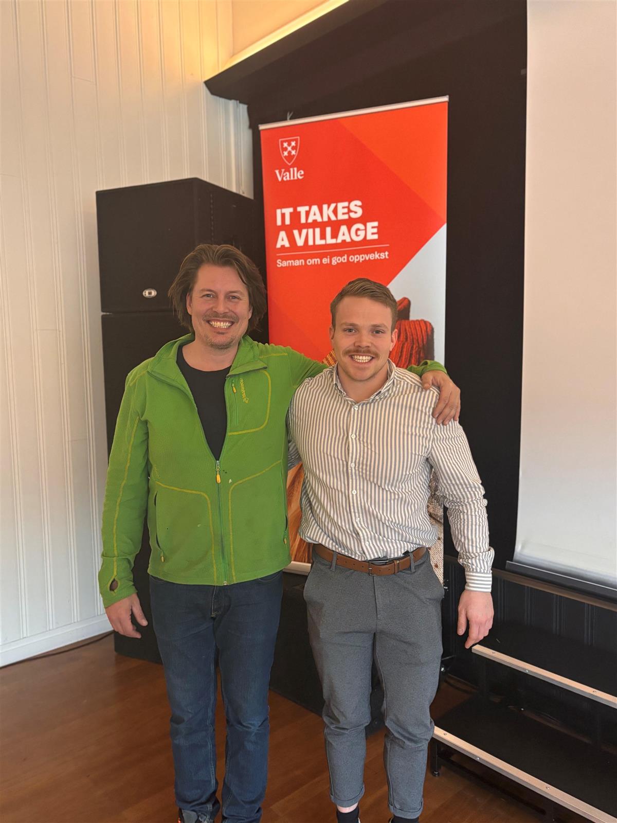 Aleksander Read (t.v.) og barnehageleiar i Valle kommune, Torgeir Helle, under It takes a Village".
