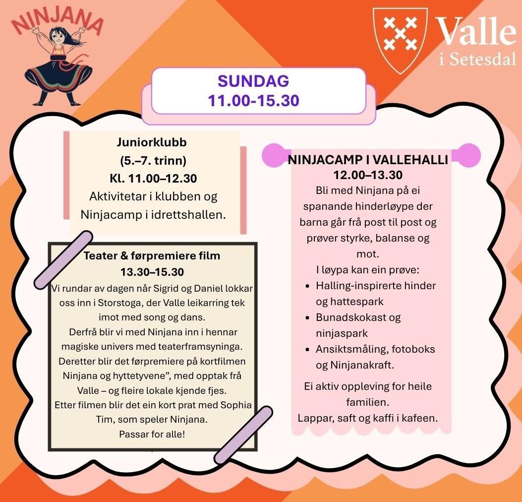 Sundagen inneheld mellom anna juniorklubb (5.- 7. klasse) frå klokka 11.00-12.30, aktivitetar i klubben og ikkje minst Ninjanacamp i Vallehalli med bunadskast, ninjaspark, leikarring, ansiktsmåling og smaking av Ninjakraft 12.00-13.30 i Vallehalli. Valle leikarring er klar med lokking & dans klokka 13.30-14.00. Så er Valle-jenta Ninjana sterkt til stades både som teater og film! Sigrid og Daniel lokkar store og små inn til Storstoga, der Valle leikarring tar imot med song og dans. Så er det klart for framsyning av “Ninjana og det store skredet" og filmen ”Ninjana og hyttetyvene" frå 14.00-15.00.