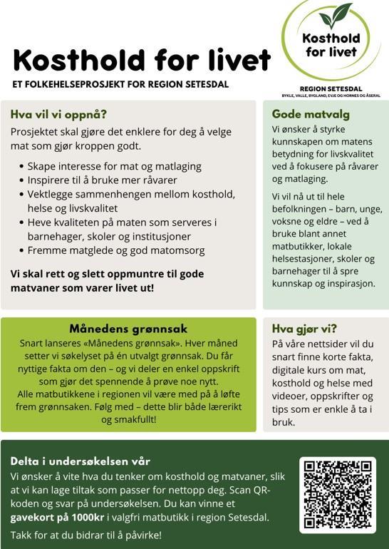 Prosjektet “Kosthald for livet” i regi av Lokalmedisinske tenester Setesdal har som mål å auke kunnskapsnivået om mat i region Setesdal, for å gjere det enklare å ta gode matval i kvardagen. Som ein del av prosjektet er det no utvikla ei spørjeundersøking ein håpar at mange tar seg tid til å svare på.