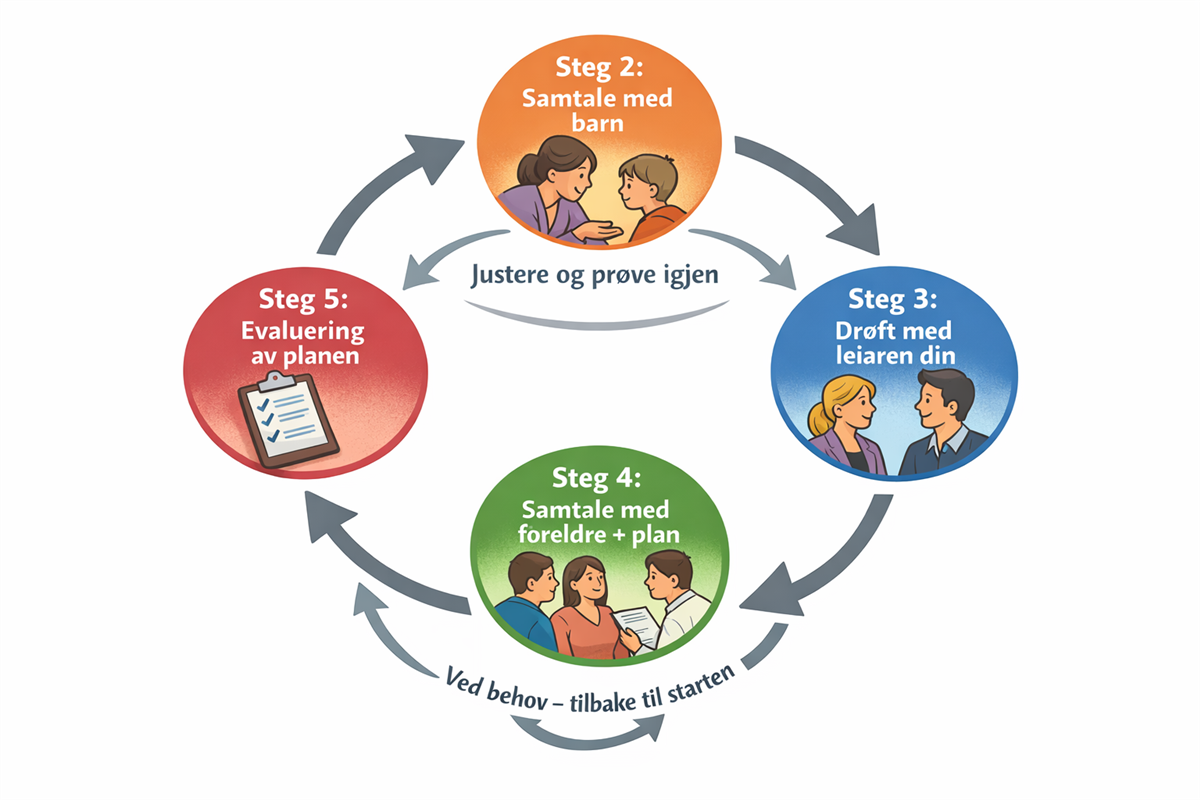 Tiltaka har hatt noko effekt. Skal ein halde fram med dei same tiltaka, justere dei eller nye tiltak? Avtal tid og stad for nytt evalueringsmøte. Begynn på steg 3 igjen.